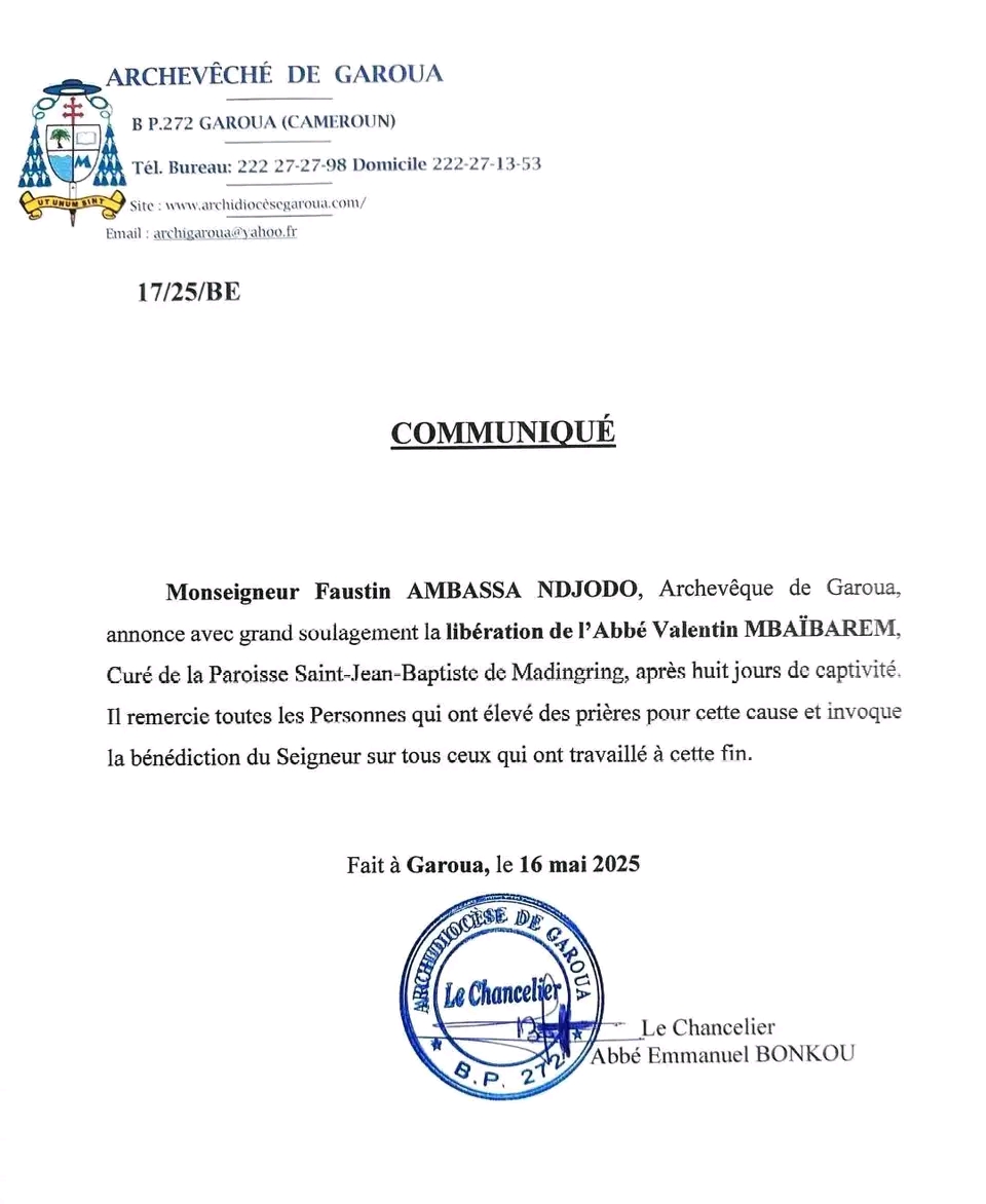 C’est avec un grand soulagement que Monseigneur Faustin Ambassa Ndjodo, Archevêque métropolitain de Garoua, a fait part de la nouvelle. Le prélat a tenu à remercier vivement tous ceux qui ont élevé des prières en faveur de l’abbé et à invoquer la bénédiction divine sur les personnes ayant contribué à sa libération.