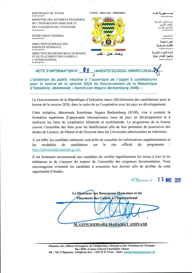 Le ministère des Affaires étrangères, de l’Intégration africaine et des Tchadiens de l’étranger a publié, ce mercredi 25 mars 2026, une note d’information annonçant l’ouverture des candidatures pour la bourse d’études du gouvernement indonésien, dénommée « Kemitraan Negara Berkembang (KNB) ».